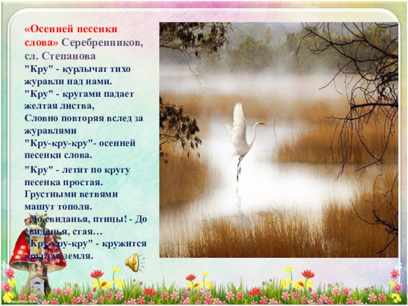 - кругами падает желтая листва, Словно повторяя вслед за журавлями "Кру-кру-кру"- осенней песенки слова.