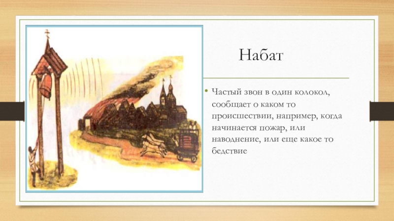 НабатЧастый звон в один колокол, сообщает о каком то происшествии, например, когда начинается пожар, или наводнение, или