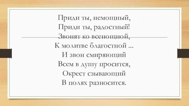 Приди ты, немощный, Приди ты, радостный! Звонят ко всенощной, К молитве благостной ... И звон смиряющий Всем