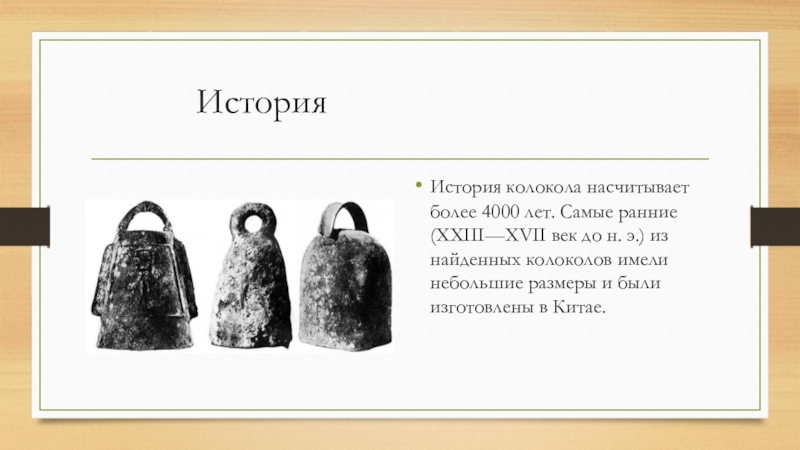 ИсторияИстория колокола насчитывает более 4000 лет. Самые ранние (XXIII—XVII век до н. э.) из найденных колоколов имели небольшие размеры