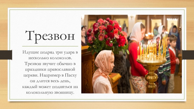 ТрезвонИдущие подряд три удара в несколько колоколов. Трезвон звучит обычно в праздники православной церкви. Например в Пасху