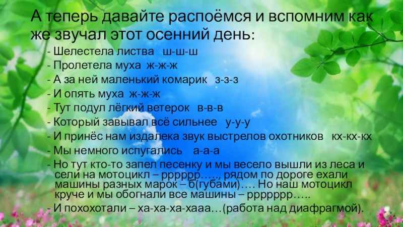 - И похохотали – ха-ха-ха-хааа…(работа над диафрагмой).