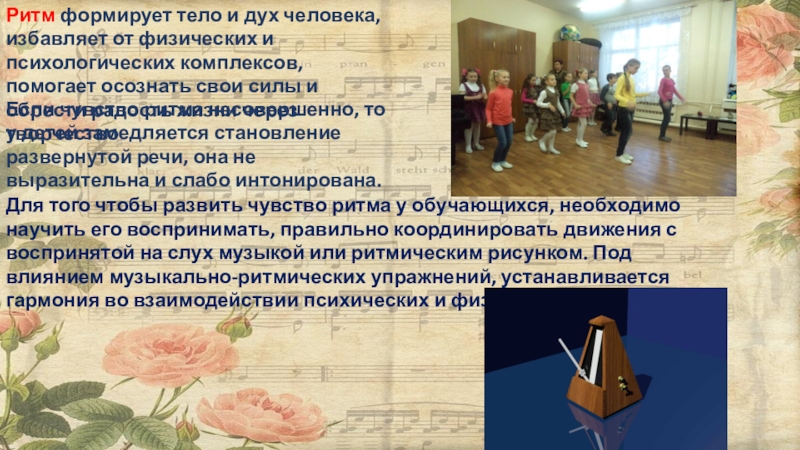 Если чувство ритма несовершенно, то у детей замедляется становление развернутой речи, она не выразительна и слабо интонирована.