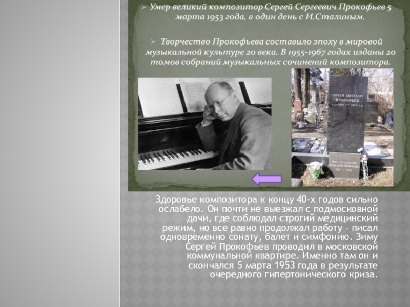 выезжал с подмосковной дачи, где соблюдал строгий медицинский режим, но все равно продолжал работу – писал одновременно сонату, балет и симфонию. Зиму Сергей Прокофьев проводил в московской коммунальной квартире. Именно там он и скончался 5 марта 1953 года в результате очередного гипертонического криза.