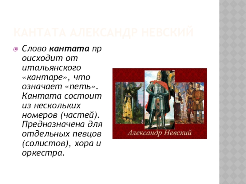 КАНТАТА АЛЕКСАНДР НЕВСКИЙСлово кантата происходит от итальянского «кантаре», что означает «петь». Кантата состоит из нескольких номеров (частей). Предназначена для