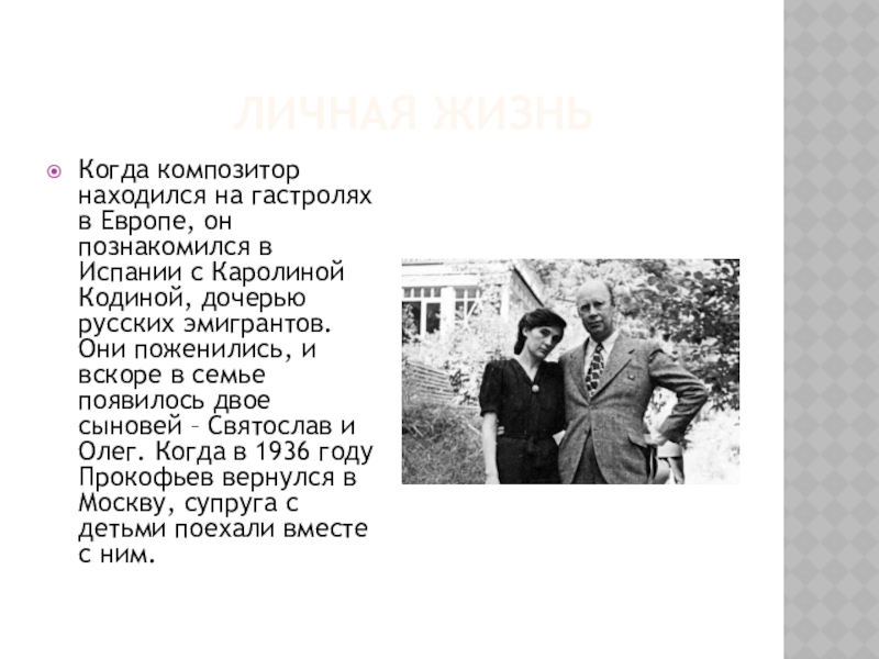 познакомился в Испании с Каролиной Кодиной, дочерью русских эмигрантов. Они поженились, и вскоре в семье появилось двое сыновей – Святослав и Олег. Когда в 1936 году Прокофьев вернулся в Москву, супруга с детьми поехали вместе с ним.