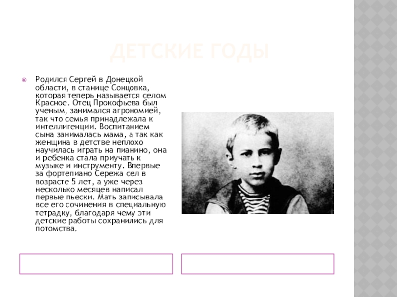 которая теперь называется селом Красное. Отец Прокофьева был ученым, занимался агрономией, так что семья принадлежала к интеллигенции. Воспитанием сына занималась мама, а так как женщина в детстве неплохо научилась играть на пианино, она и ребенка стала приучать к музыке и инструменту. Впервые за фортепиано Сережа сел в возрасте 5 лет, а уже через несколько месяцев написал первые пьески. Мать записывала все его сочинения в специальную тетрадку, благодаря чему эти детские работы сохранились для потомства.