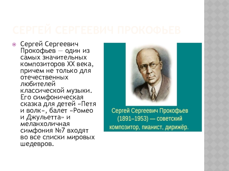 XX века, причем не только для отечественных любителей классической музыки. Его симфоническая сказка для детей «Петя и волк», балет «Ромео и Джульетта» и меланхоличная симфония №7 входят во все списки мировых шедевров.