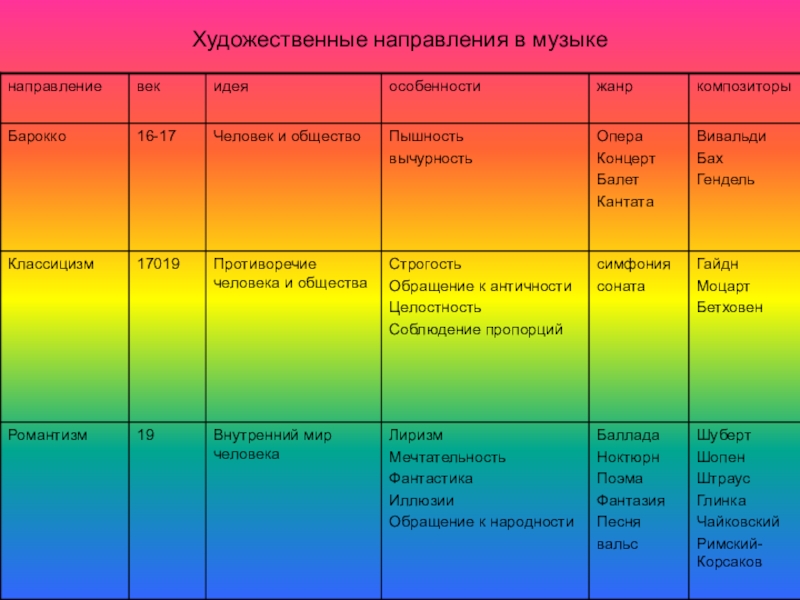 Слово «романтизм» в переводе означало «странное», «фантастическое», «живописное». Характеризуется крайним субъективизмом, неудовлетворенностью настоящим и земным, стремлением к грандиозному, сверхъестественному, пристрастием к старине, народности. Главная задача – внутренний мир человека. Представители этого направления : Шуберт, Шопен, Штраус, Чайковский, Глинка, Римский-Корсаков и др.
