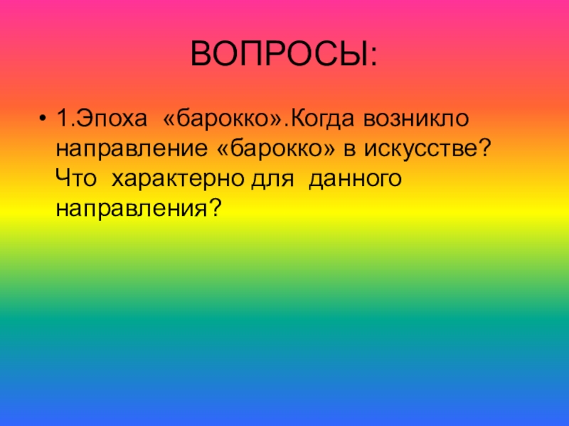 1.Эпоха «барокко».Когда возникло направление «барокко» в искусстве? Что характерно для данного