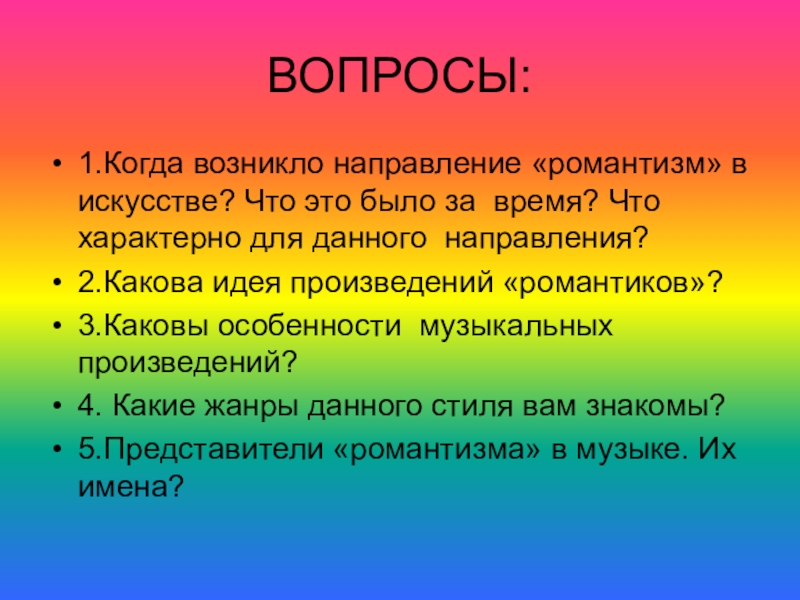 1.Когда возникло направление «романтизм» в искусстве? Что это было за время?
