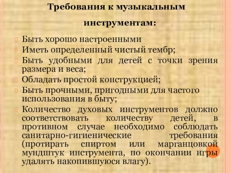 Количество духовых инструментов должно соответствовать количеству детей, в противном случае необходимо соблюдать санитарно-гигиенические требования (протирать спиртом или марганцовкой мундштук инструмента, по окончании игры удалять накопившуюся влагу).