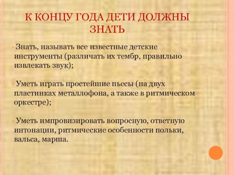 Уметь играть простейшие пьесы (на двух пластинках металлофона, а также в ритмическом оркестре);
