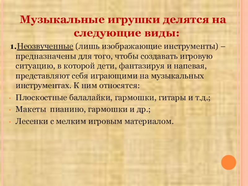 Слайд 7Музыкальные игрушки делятся на следующие виды: