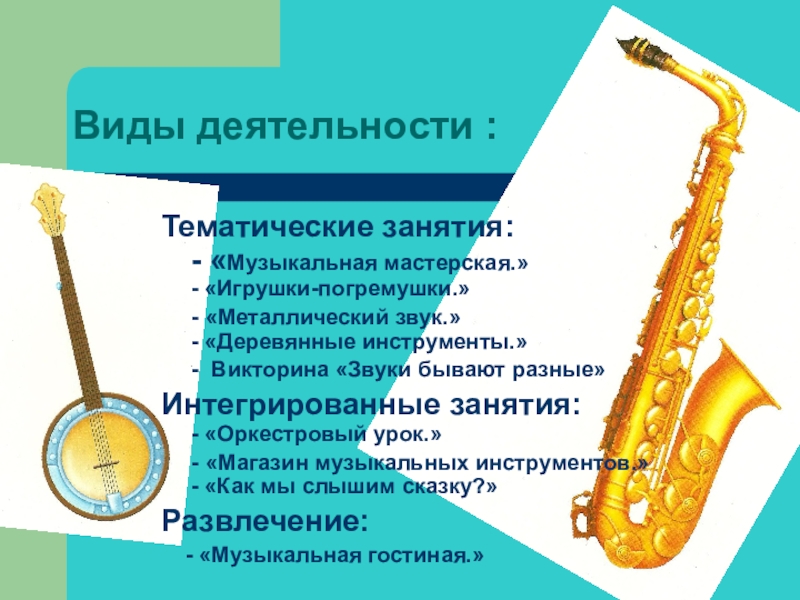 предназначены для того, чтобы создавать игровую ситуацию, в которой дети, фантазируя и напевая, представляют себя играющими на музыкальных инструментах. К ним относятся:
