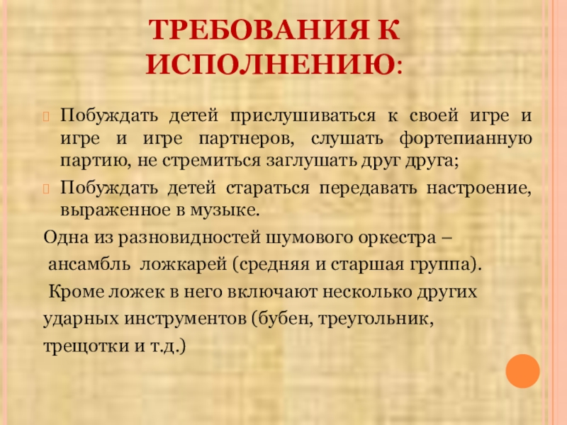 7. Партии шумовых инструментов и инструментов, не имеющих звукоряда, выучиваются под фортепианное сопровождение, под пение.