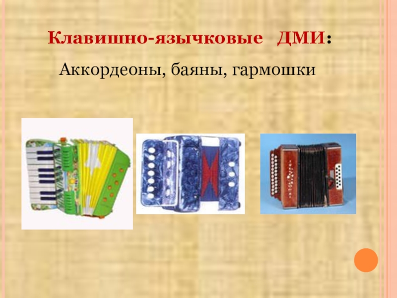 Слайд 12Клавишно-язычковые ДМИ: Аккордеоны, баяны, гармошки