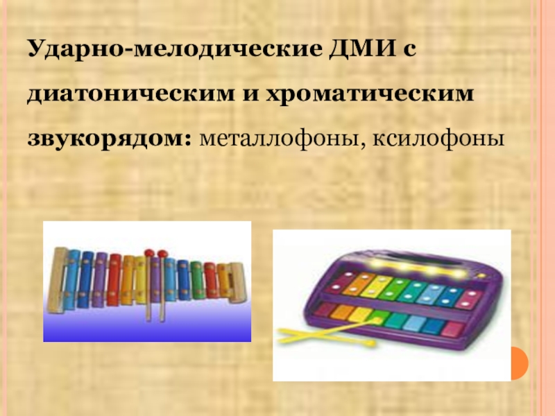 Слайд 14Ударно-мелодические ДМИ с диатоническим и хроматическим звукорядом: металлофоны, ксилофоны