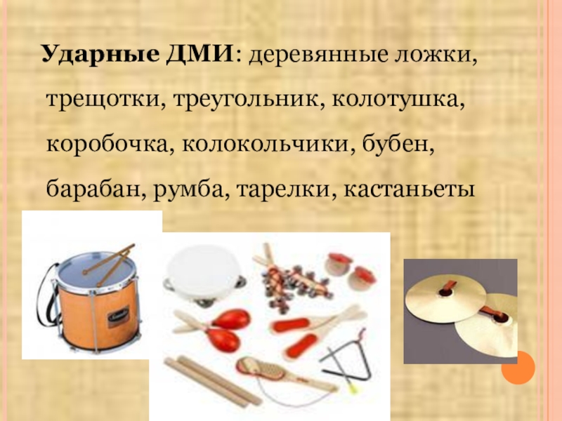 Слайд 13Ударные ДМИ: деревянные ложки,