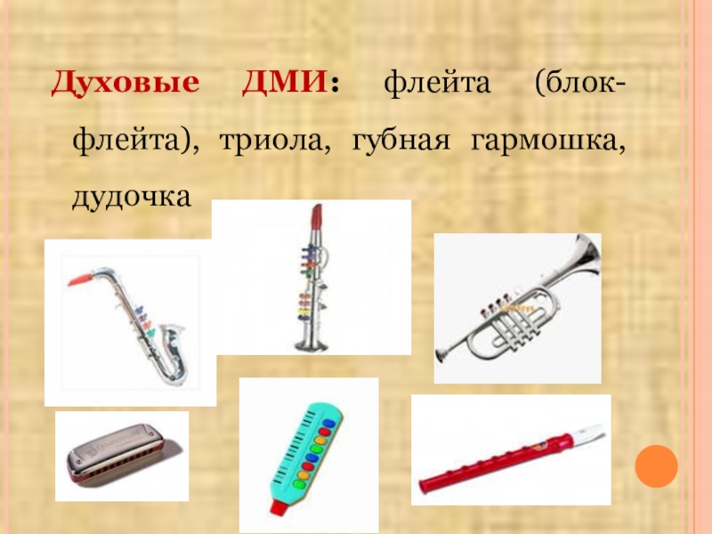 Слайд 10Духовые ДМИ: флейта (блок-флейта), триола, губная гармошка, дудочка