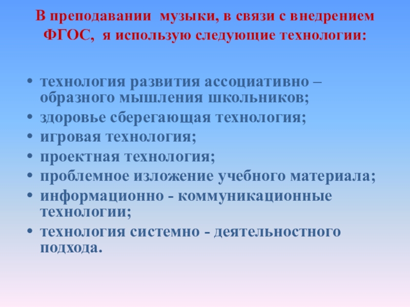 Слайд 4В преподавании музыки, в связи с внедрением ФГОС, я использую следующие