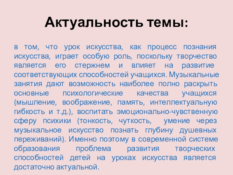 играет особую роль, поскольку творчество является его стержнем и влияет на развитие соответствующих способностей учащихся. Музыкальные занятия дают возможность наиболее полно раскрыть основные психологические качества учащихся (мышление, воображение, память, интеллектуальную гибкость и т.д.), воспитать эмоционально-чувственную сферу психики (тонкость, чуткость, умение через музыкальное искусство познать глубину душевных переживаний). Именно поэтому в современной системе образования проблема развития творческих способностей детей на уроках искусства является достаточно актуальной.