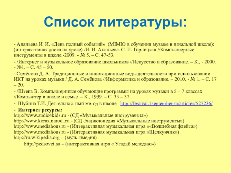 музыке в начальной школе): (интерактивная доска на уроке) /И. И. Ананьева. С. И. Горлицкая //Компьюиерные инструменты в школе.-2009. - № 5. – С. 47-53.