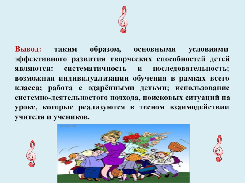 Слайд 25Вывод: таким образом, основными условиями эффективного развития творческих способностей детей являются: