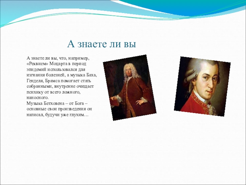 в период эпидемий использовался для изгнания болезней, а музыка Баха, Генделя, Брамса помогает стать собранными, внутренне очищает психику от всего ложного, наносного.