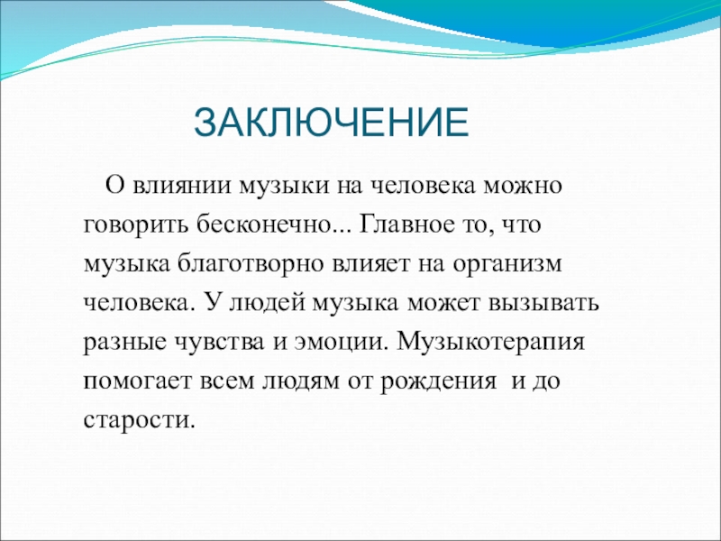 музыка благотворно влияет на организм человека. У людей музыка может вызывать разные чувства и эмоции. Музыкотерапия помогает всем людям от рождения и до старости.