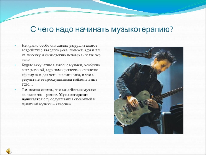 Т.е. можно сказать, что воздействие музыки на человека – разное. Музыкотерапия начинается с прослушивания спокойной и приятной музыки – классика