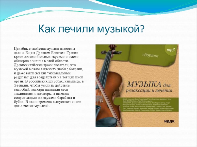 Еще в Древнем Египте и Греции врачи лечили больных звуками и имели обширные знания в этой области. Древнекитайские врачи полагали, что музыкой можно вылечить любые болезни, и даже выписывали "музыкальные рецепты" для воздействия на тот или иной орган. В российских широтах, например, в Эвенкии, чтобы усилить действие снадобий, знахари напевали свои заклинания и заговоры, а шаманы сопровождали их звуками барабана и бубна. В наши времена выпускают книги для лечения музыкой.