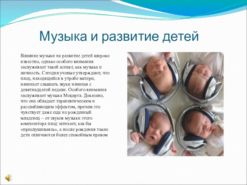 широко известно, однако особого внимания заслуживает такой аспект, как музыка и личность. Сегодня ученые утверждают, что плод, находящийся в утробе матери, начинает слышать звуки начиная с девятнадцатой недели. Особого внимания заслуживает музыка Моцарта. Доказано, что она обладает терапевтическим и расслабляющим эффектом, причем это чувствует даже еще не рожденный младенец – от звуков музыки этого композитора плод затихает, как бы «прислушиваясь», а после рождения такие дети отличаются более спокойным нравом