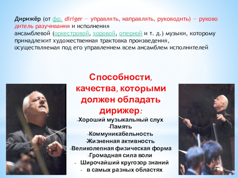 Дирижёр (от фр. diriger — управлять, направлять, руководить) — руководитель разучивания и исполнения ансамблевой (оркестровой, хоровой, оперной и т. д.) музыки, которому принадлежит художественная трактовка произведения, осуществляемая под его управлением всем ансамблем исполнителейСпособности, качества, которыми должен обладать дирижер:Хороший музыкальный слухПамятьКоммуникабельностьЖизненная активностьВеликолепная физическая формаГромадная сила волиШирочайший кругозор знаний