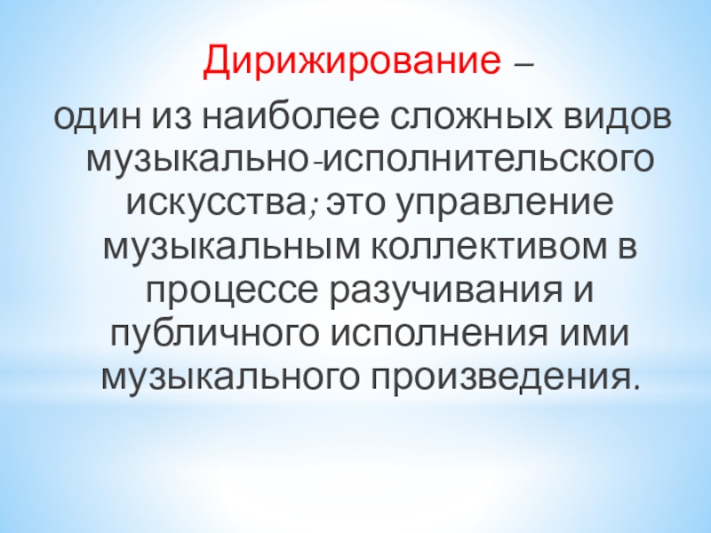 Дирижирование – один из наиболее сложных видов музыкально-исполнительского искусства; это управление музыкальным коллективом в процессе разучивания