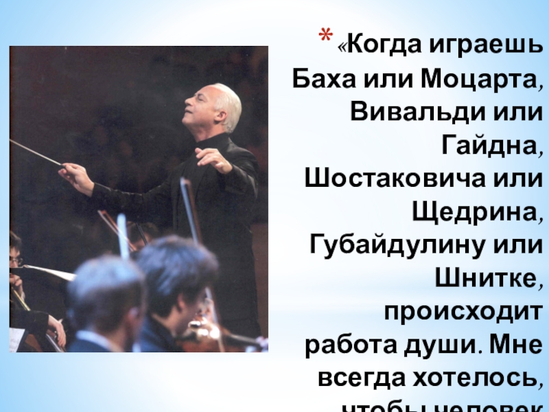 Губайдулину или Шнитке, происходит работа души. Мне всегда хотелось, чтобы человек после концерта чувствовал себя окрыленным». В. Спиваков