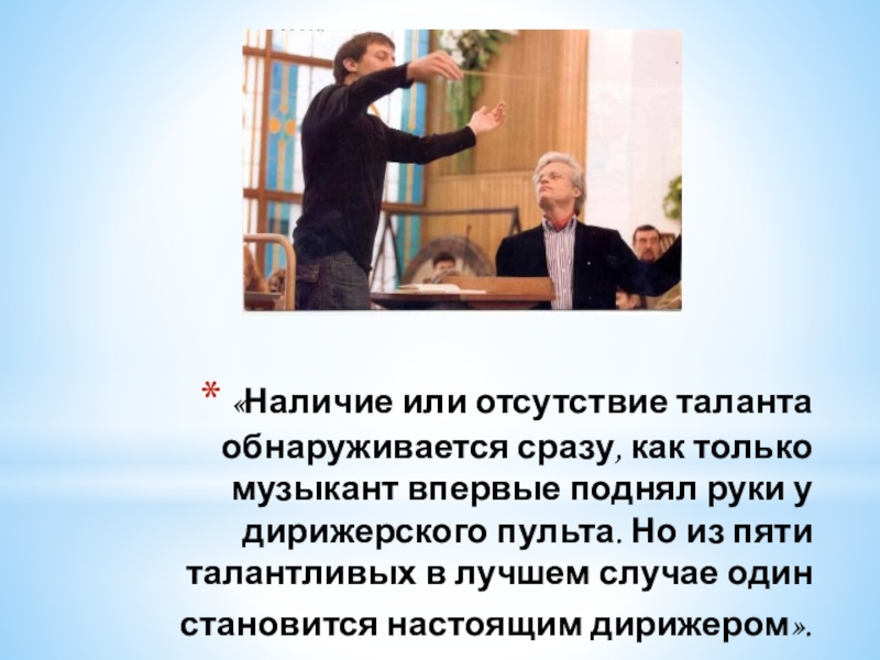 «Наличие или отсутствие таланта обнаруживается сразу, как только музыкант впервые поднял руки у дирижерского пульта. Но из