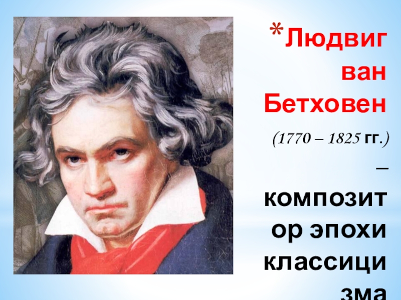 Слайд 13Людвиг ван Бетховен (1770 – 1825 гг.) – композитор эпохи классицизма