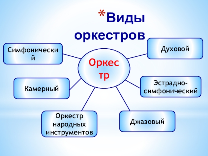 Виды оркестровДжазовыйЭстрадно-симфоническийОркестр народных инструментовДуховойКамерный СимфоническийОркестр
