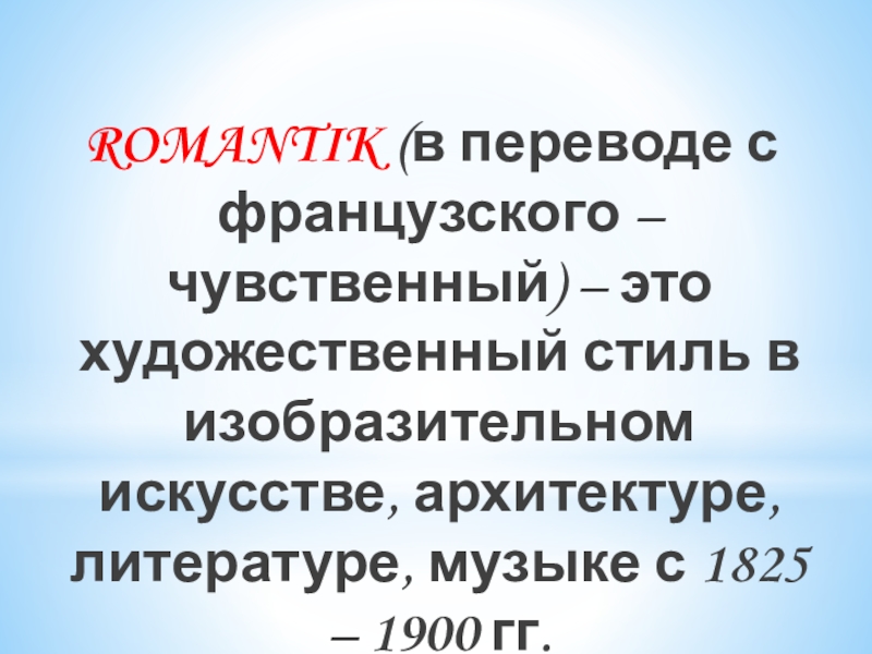 ROMANTIK (в переводе с французского – чувственный) – это художественный стиль в изобразительном искусстве, архитектуре, литературе, музыке