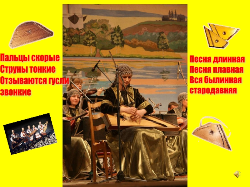 Пальцы скорые  Струны тонкие  Отзываются гусли  звонкиеПесня длинная  Песня плавная  Вся былинная