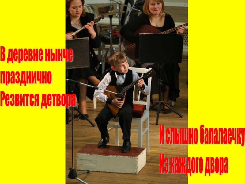 В деревне нынче  празднично  Резвится детвора И слышно балалаечку  Из каждого двора
