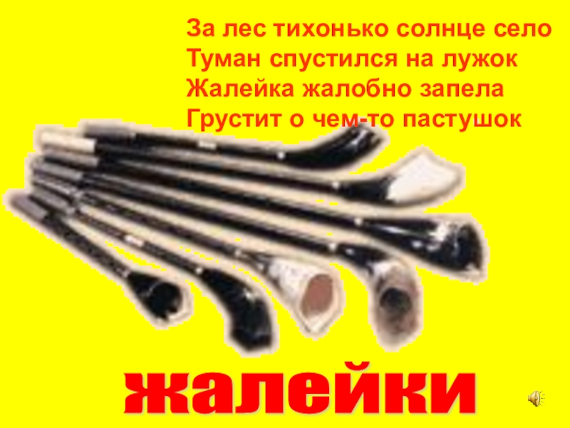 жалейкиЗа лес тихонько солнце селоТуман спустился на лужок   Жалейка жалобно запела    Грустит