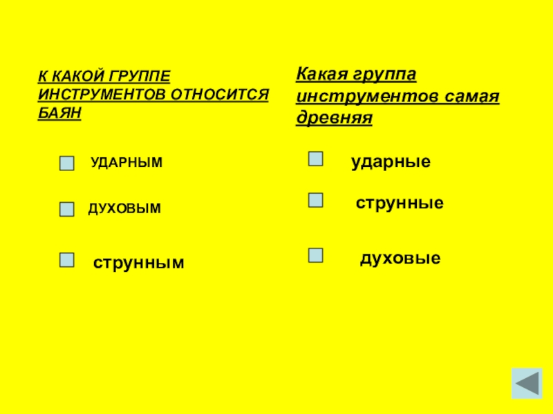 К КАКОЙ ГРУППЕ ИНСТРУМЕНТОВ ОТНОСИТСЯ  БАЯНУДАРНЫМДУХОВЫМструннымКакая группа инструментов самая древняяударныеструнныедуховые