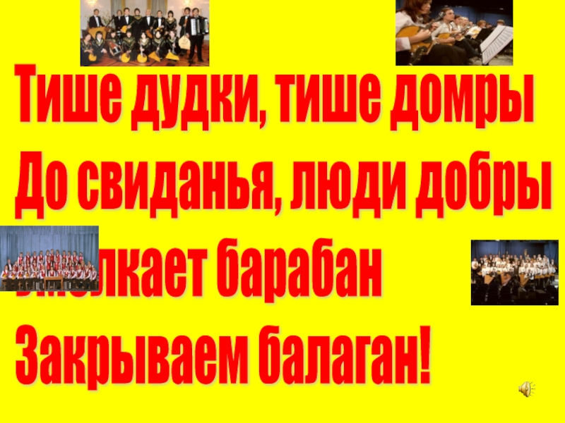 Тише дудки, тише домры  До свиданья, люди добры  Умолкает барабан  Закрываем балаган!