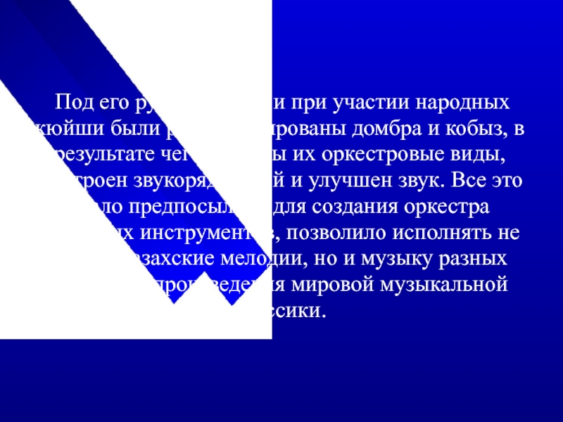 домбра и кобыз, в результате чего созданы их оркестровые виды, выстроен звукоряд, строй и улучшен звук. Все это стало предпосылкой для создания оркестра народных инструментов, позволило исполнять не только казахские мелодии, но и музыку разных народов и произведения мировой музыкальной классики.