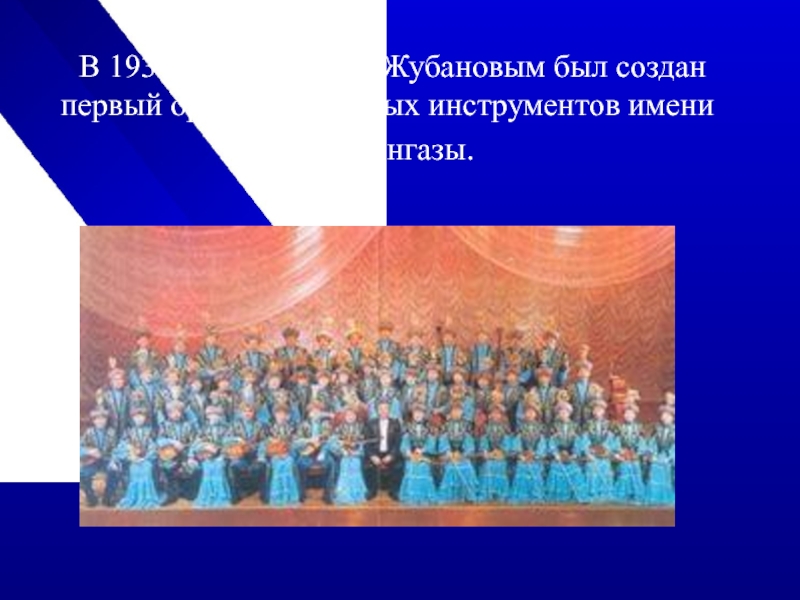 Слайд 28 В 1934 году Ахметом Жубановым был создан первый оркестр народных