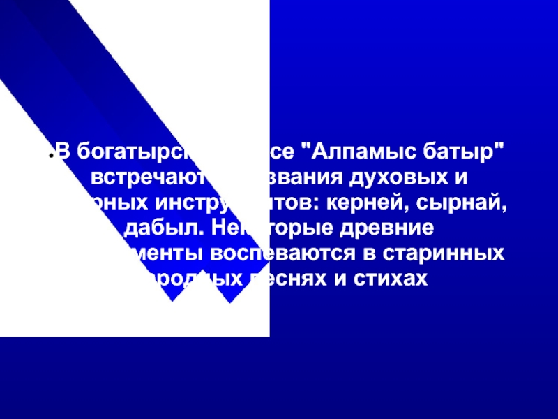 Слайд 6В богатырском эпосе "Алпамыс батыр" встречаются названия духовых и ударных инструментов: