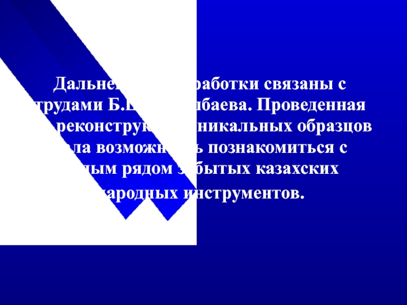 Слайд 9Дальнейшие разработки связаны с трудами Б.Ш. Сарыбаева. Проведенная им реконструкция уникальных