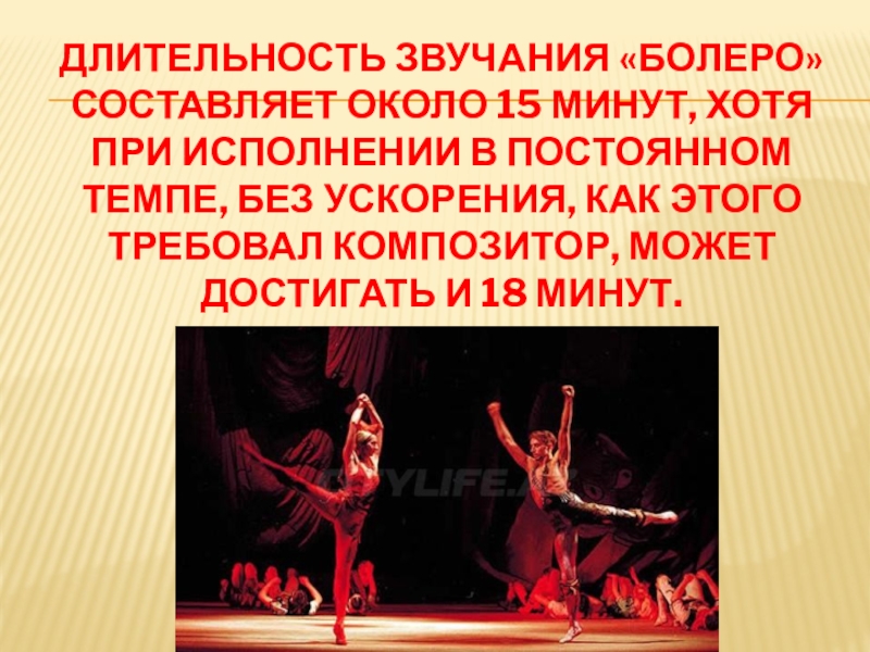 Слайд 6Длительность звучания «Болеро» составляет около 15 минут, хотя при исполнении в